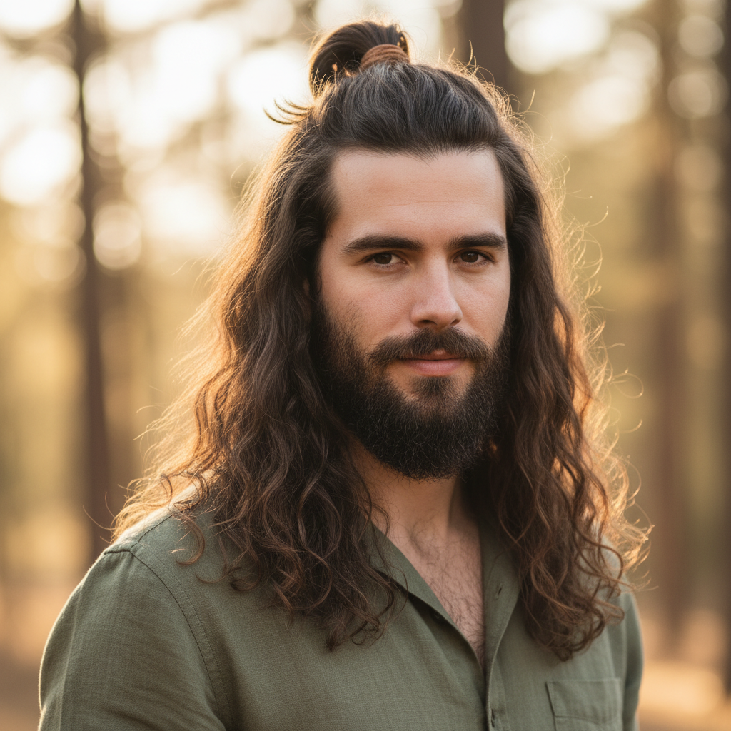 Le “half-up bun” ou demi-queue consiste à attacher uniquement la partie supérieure des cheveux, en laissant le reste détaché. C’est l’un des hairstyles les plus intéressants for long hair men parce qu’il :